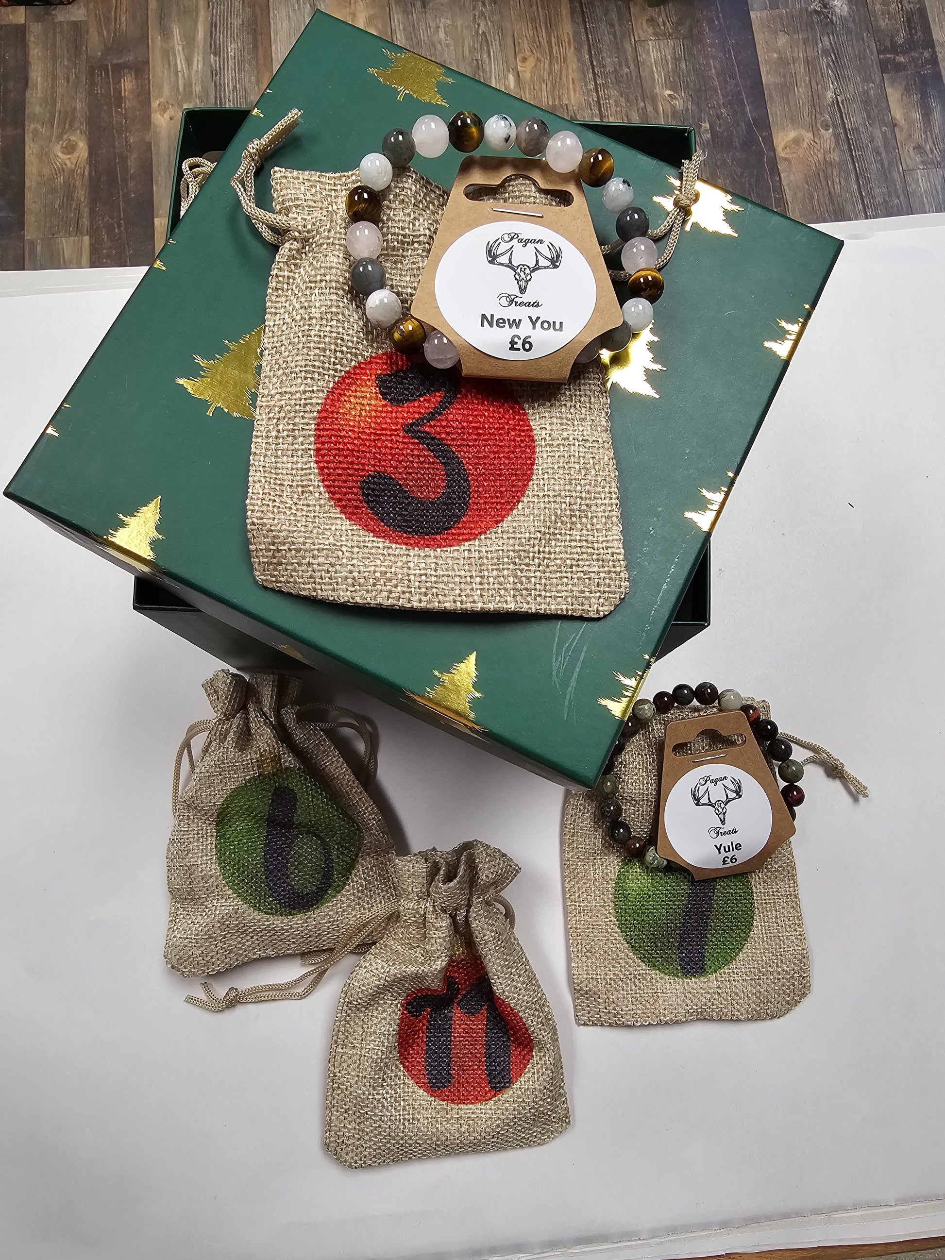 Yule Bracelet Advent calendar 1-12. A mixture of chips, beads and our very own mixed bracelets, a new Bracelet everyday.